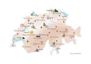 Per monitorare la colorazione delle foglie durante la stagione autunnale, Svizzera Turismo presenta la “mappa dei colori” che mostra in tempo reale lo stato attuale e la previsione della colorazione delle foglie nelle aree boschive di tutta la Svizzera. È stata sviluppata in collaborazione con il servizio meteo della SRF. Quattro specie arboree giocano un ruolo importante: acero, betulla, faggio e larice, poiché le chiome di questi alberi assumono un colore particolarmente luccicante. La mappa mostra a colpo d’occhio la posizione e il colore delle foglie al momento della ricerca.