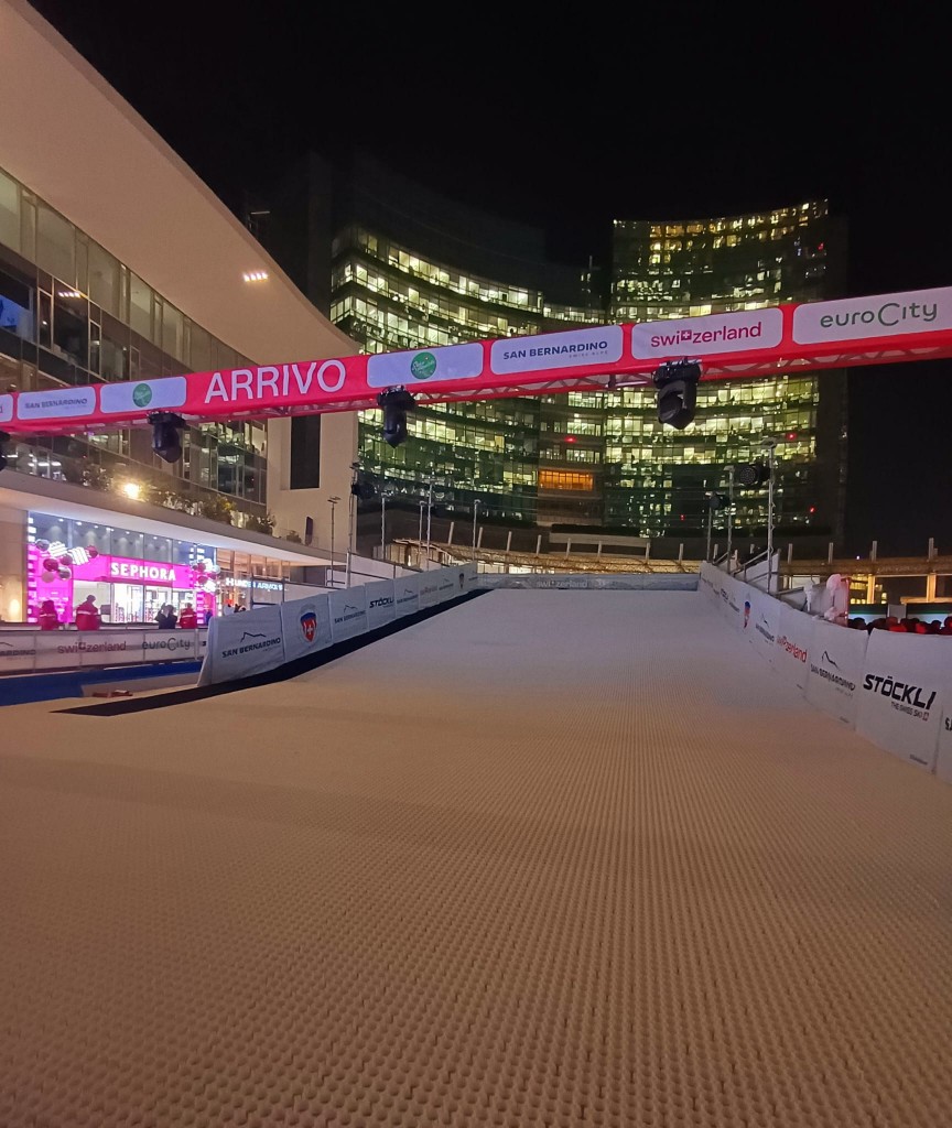 la pista da sci dello Swiss Winter Village in piazza Gae Aulenti a Milano