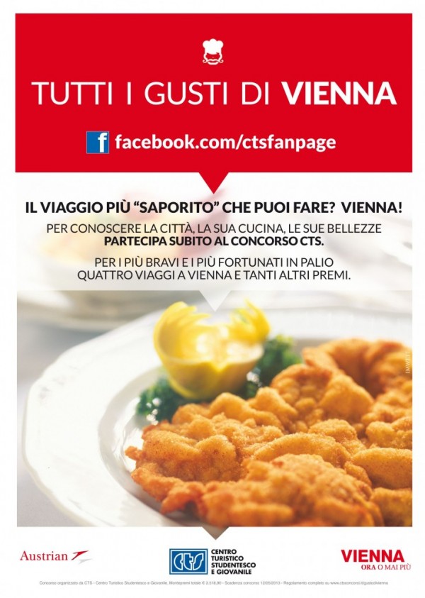 Cts – Centro Turistico Studentesco e Giovanile – e WienTourismus rinnovano la collaborazione per promuovere la capitale austriaca con il concorso ”Tutti i gusti di Vienna” che partendo da Facebook permette di conoscere il lato goloso della città. Gli utenti che visiteranno la facebook fanpage di Cts dovranno indovinare gli ingredienti delle più celebri ricette viennesi. In palio un viaggio a Vienna per due persone estratte a sorte: un utente che ha partecipato come chef e uno che ha votato. “Tutti i gusti di Vienna” si concluderà il 12 maggio 2013. Partner tecnico di tutta l’iniziativa è Austrian Airlines.