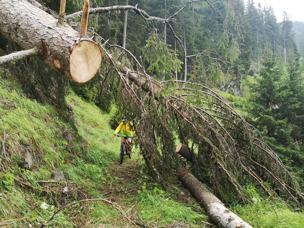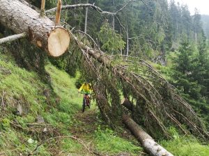 La partenza da San Lorenzo di Sebato volge le bici verso Santo Stefano, per poi deviare verso Palù, poi Krinnerhof. Da qui inizia un po’ a salire, per sterrati e cavedagne, l’escursione si fa interessante con la valle alla nostra sinistra verso il rifiugio Moosener Kassern – Moosenerberg a 1200m. e poi salendo verso Plan de Corones attraverso sentieri e prati, ancora con gli alberi caduti di traverso, che danno un pizzico di avventura al percorso. Una sosta ristoratrice, prima di tornare alla base la si può fare a 1.354 metri di quota, all’Almdorf Haidenberg, un vero e proprio rifugio per chi cerca pace e tranquillità per respirare aria pura, una calda ospitalità e il profumo invitante delle specialità gastronomiche altoatesine.