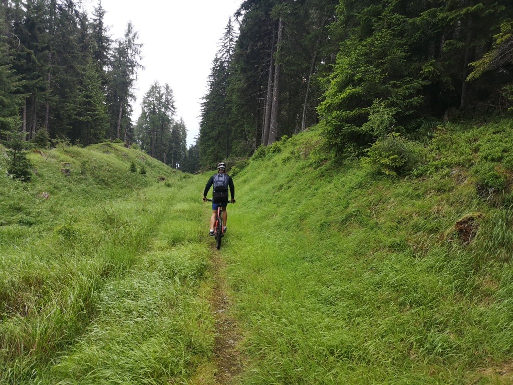 Quasi in vetta al Plan, 1200 metri di dislivello percorsi si possono girare le biciclette per scendere verso valle, in una emozionante discesa controllata dalla poderosa franata “a disco” delle stupefacenti E-bike, non prima di una sosta ristoratrice per un giro che a conti fatti ha contato 35 chilometri dei quali la metà in salita e fra i boschi, un bellissimo modo di esplorare “il panettone” del Kron platz e non solo esercitare una bella attività fisica ma anche un’esplorazione intelligente di un territorio che non finisce mai di stupire.
