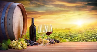 Red And White Wineglasses With Old Barrel And Botte And Grapes In Vineyard At Dust