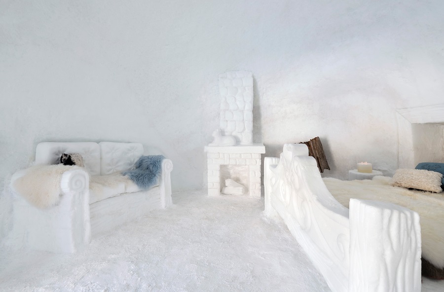 Anche quest’anno, l’artista Vania Cusini ha trasformato anonimi blocchi di neve in due camere dal design alpino, ispirato ai secolari boschi di larice che coprono le pendici della valle di Livigno, e alle loro leggende. Una grande opera d’arte che discende direttamente dall’esperienza di Art In Ice, il contest di scultura internazionale di neve, promossa per 17 anni da Lungolivigno, sostenitore della centralità dell’arte anche tra le vette.