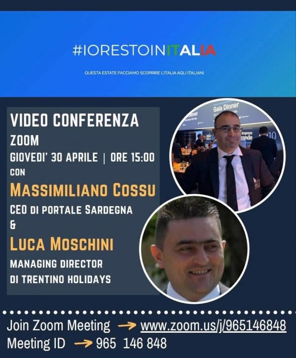 Oggi alle 15.00, su Zoom, (coordinate, Zoom www.zoom.us/j/965146848 , Meeting ID: 965 146 848) tramite video conferenza, due imprenditori dallo spirito pionieristico: Massimiliano Cossu, Ceo di Portale Sardegna, e Luca Moschini, Managing Director di Trentino Holidays, parleranno nell’ambito del progetto.