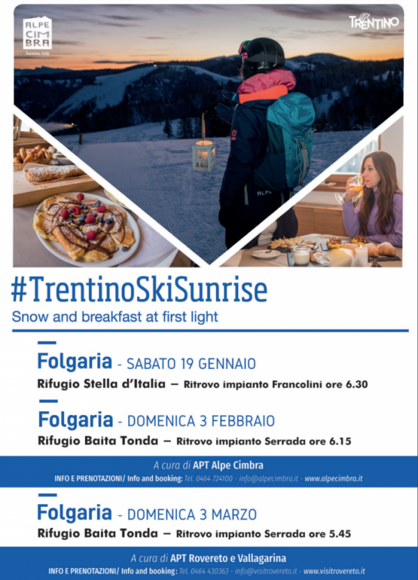 Si ripropone, dopo il successo delle edizioni precedenti, il “Trentino Ski Sunrise”, una serie di tre appuntamenti al sorgere del sole organizzati dall’Apt Alpe Cimbra, per le prime due date, e Apt Rovereto e Vallagrina, per l’ultima. Le giornate saranno a Folgaria sabato 19 gennaio, (rifugio Stella d’Italia) domenica 3 febbraio, domenica 3 marzo (rifugio Baita Tonda), per una ricca colazione, all’alba in rifugio e prima discesa sulla neve immacolata sulle piste. Il programma prevede il ritrovo attorno alle ore 5.45 presso la biglietteria degli impianti di risalita, rispettivamente impianto Francolini per il primo, impianto Serranda, per gli altri due, con accredito e risveglio con tisane e tante buone cose.