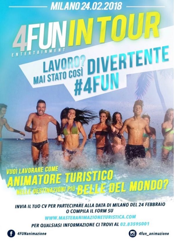 E’ tempo di pensare all’estate, per chi fa del divertimento organizzato un mestiere. Partono infatti, in questo periodo i recruitment per quelle figure professionali che si incaricano in strutture estive, sia in Italia che all’estero, di allietare, organizzare, gestire, facilitare le vacanze degli italiani e non solo. Non fa eccezione 4fun (vedi il servizio su Travelopendaily ) che il prossimo 24 febbraio a Milano darà vita alla prima tappa del “4fun in tour”.