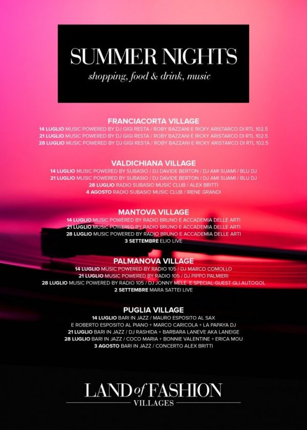 Nel mese di luglio nelle date del 14, 21 e 28 tutti i negozi dei cinque Villaggi resteranno aperti fino alle 23:00. In queste occasioni anche i punti ristoro resteranno aperti fino alle ore 24:00 e il tutto sarà accompagnato da musica live e dj set dalle mille sfumature che vivranno nelle piazze principali dei Villaggi: a Palmanova Village sarà la partnership con Radio105 ad accendere il Villaggio con Dj Marco Comollo, Dj Pippo Palmieri, Dj Jonny Mele e Special guest GLI AUTOGOL, il tutto accompagnato da cocktails speciali creati per le serate dal bartender Mr. Simon, celebre proprietario del Bar Segreto di Udine, Club esclusivo accessibile solo su invito; Puglia Village invece lancerà una programmazione frutto di una collaborazione con «Bari in Jazz», portando in Villaggio ospiti locali e internazionali come Erica Mou, cantautrice pugliese, DJ Rashida, di origini americane, nota per la sua fusione di hip-hop , funk, musica soul, dancehall, house, pop e rock, Coco Maria e Bonnie Valentine; la musica di Franciacorta Village sarà firmata RTL 102.5 ed accompagnerà la degustazione di signature e classic drinks del Dialogue Lounge Bar: cocktail bar esperienziale di Brescia che per queste serate si trasferirà dal centro Città proprio nel cuore del Villaggio; Valdichiana Village presenterà Radio Subasio Music Club, il format esclusivo che racchiude i più grandi artisti italiani ed internazionali; Mantova Village in partnership con Radio Bruno e Accademia delle Arti allestirà postazioni per Dj Set e musica live con sassofonisti, pianisti e percussionisti d’eccezione proponendo un repertorio commerciale con nuovi arrangiamenti per gli amanti del jazz e blues.