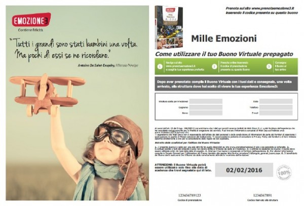 Emozione3 ha scelto di digitalizzare il voucher contenuto all’interno dei cofanetti. Da oggi infatti, sarà possibile navigare sul sito www.emozione3.it, acquistare online il cofanetto desiderato e scegliere se riceverlo tramite posta standard o e-mail. Selezionando quest’ultima opzione, una volta completato l’acquisto, si riceverà immediatamente via e-mail il Buono Elettronico con il codice di prenotazione attivo, pronto per essere utilizzato sul sito https://booking.emozione3.it/. «Da sempre Emozione3 è attenta ai trend del mercato e alle esigenze della propria clientela, che è sempre più connessa e attiva online – ha dichiarato Andrea Dusi, amministratore delegato Wish Days –. Il nostro obiettivo è essere sempre al passo con i tempi con iniziative e progetti innovativi che coinvolgano anche il mondo digitale, pertanto abbiamo pensato ad una soluzione per rendere i voucher dei cofanetti fruibili nell’immediato, risolvendo così i problemi del regalo dell’ultimo minuto».