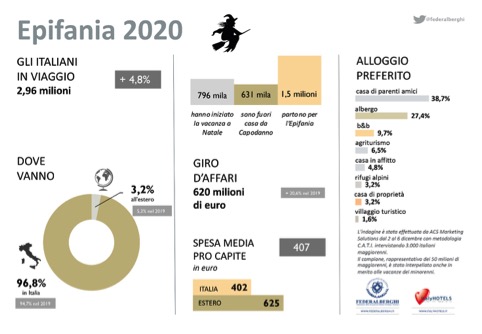 Saranno complessivamente 2 milioni e 955 mila gli italiani in viaggio nei giorni dell’Epifania, per una crescita del 4,8% rispetto all’anno scorso. Nel 96,8% dei casi chi si muoverà da casa sceglierà la Penisola come destinazione della vacanza, mentre il restante 3,2% privilegerà le mete estere. Da segnalare anche il consistente incremento del giro d’affari generato durante il fine settimana della Befana, che si attesterà sui 620 milioni di euro, facendo segnare un incremento di ben il 20,6% sul 2019.