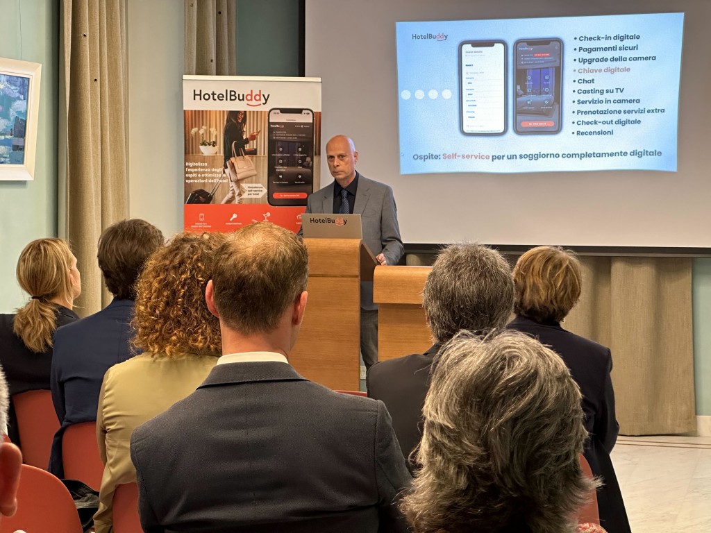 Dopo l’introduzione dei “padroni di casa”, è stata la volta di Lucio Perrone, responsabile business development di HotelBuddy, che ha raccontato le unicità del progetto e la soluzioni offerte agli albergatori dal software. Tra i servizi inclusi che hanno destato il maggiore interesse tra il pubblico presente, il check in e check out digitale, la presenza di una chat che permette un dialogo diretto con gli ospiti, la possibilita di fare casting dai dispositivi degli ospiti sulla tv in camera, l’opportunità di gestire tramite il software il servizio in camera, l’upgrade, la prenotazione di servizi extra e le recensioni.