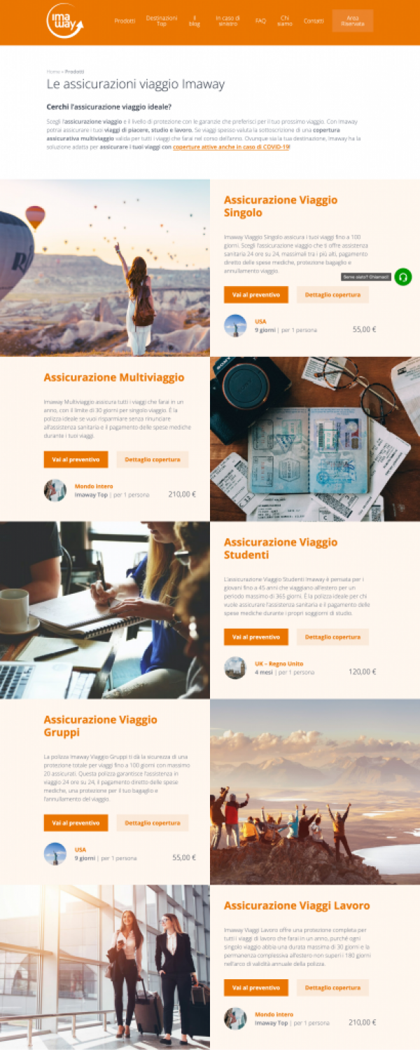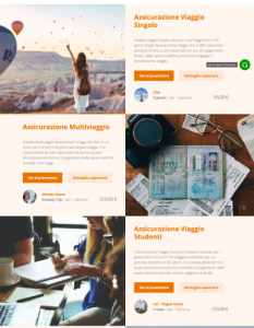 Imaway risponde a questa crescente e differenziata domanda, offrendo diverse tipologie di prodotti in grado di adattarsi ad ogni esigenza e presentando due nuove soluzioni assicurative che si vanno ad aggiungere ai 3 prodotti già esistenti sul sito. Oltre alla copertura Viaggio Singolo, che assicura viaggi fino a 100 giorni, Multiviaggio, che assicura tutti i viaggi intrapresi in un anno, con il limite di 30 giorni per singolo viaggio, e Studenti per i giovani che viaggiano all’estero per un periodo massimo di 365 giorni, sono ora disponibili le nuovissime Imaway Viaggio Gruppi e Imaway Viaggi lavoro.