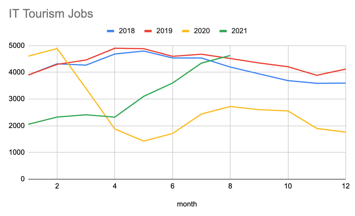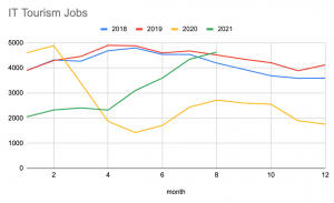 I dati diffusi dal sito per la ricerca di lavoro Indeed mostrano gli effetti del Covid-19 sui posti di lavoro nel turismo e nell’ospitalità. Gli annunci di lavoro e le ricerche contenenti keyword come “turismo” e “ospitalità” hanno recuperato e superato i livelli del 2020, anno in cui gli annunci nel settore turistico sul portale sono diminuiti del 40%. Nel 2021 si è verificato un rimbalzo, con un aumento del 70% rispetto allo stesso periodo del 2020.
