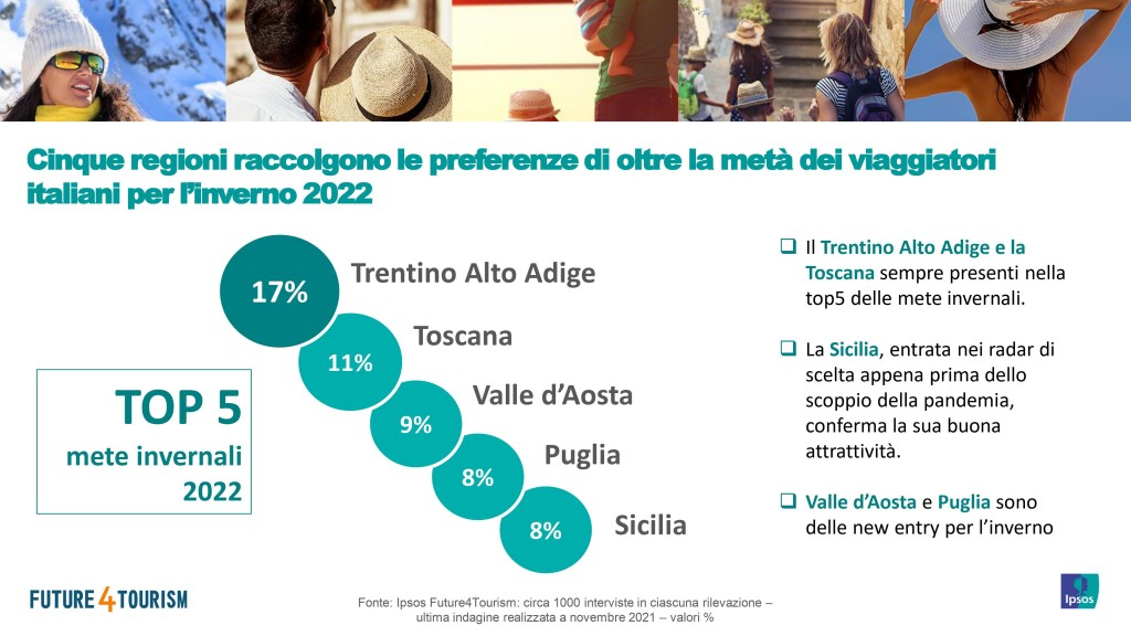 Anche la tipologia di vacanza risulta influenzata: se tra ottobre e dicembre avevamo registrato un tentativo di ripresa delle visite culturali e alle città d’arte, le previsioni per l’inverno mostrano nuovamente una contrazione. Favorite tornano perciò a essere le mete all’aria aperta: sono la montagna, la collina e il lago a registrare un incremento delle preferenze (38%) anche rispetto agli inverni precedenti. Cinque le regioni che raccolgono il favore di oltre la metà dei viaggiatori italiani per l’inverno 2022: Trentino-Alto Adige, Toscana, Valle D’Aosta, Puglia e Sicilia.