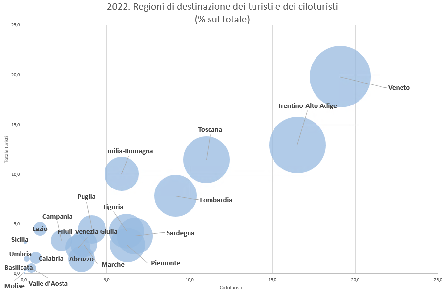 Veneto, Trentino-Alto Adige e Toscana da sole attraggono il 47% dei flussi cicloturistici del 2022, ma la domanda si va progressivamente diffondendo in tutto il Paese. Tra il 2019 e il 2022, infatti, i cicloturisti che scelgono le regioni del Sud sono passati dal 7% al 17,4% del totale. In crescita anche il Centro Italia che sale dal 10,9% al 15,8%. Per le regioni del Sud Italia, il cicloturismo rappresenta un’importante occasione per l’allungamento della stagionalità, per contrastare il fenomeno dell’over tourism e un importante volano di potenziale sviluppo in chiave turistica delle aree interne.