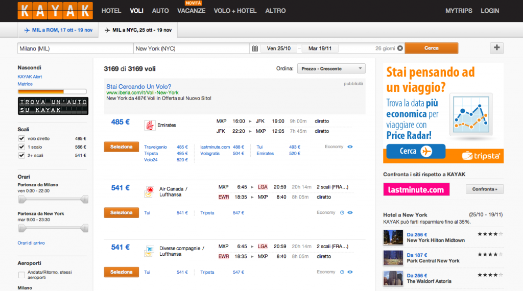 Kayak.it, motore di ricerca che confronta centinaia di siti di viaggi e permette di trovare offerte vantaggiose di voli, hotel, autonoleggi e vacanze, svela la nuova interfaccia grafica che si caratterizza per un design “ultra-minimal” dove tutti i principali campi per la ricerca sono stati allineati privilegiando uno sviluppo in orizzontale. Nella pagina dei risultati sarà poi possibile affinare la ricerca in base ai numerosi filtri a disposizione degli utenti utilizzando per esempio la categoria, il prezzo, distanza dal centro o valutazione degli utenti per gli hotel o numero di scali, compagnia aerea, orari per la ricerca voli. «Con lo sviluppo della nuova interfaccia di Kayak.it abbiamo voluto offrire agli utenti un’esperienza di ricerca e di navigazione ancora più immediata e più semplice basata su un look and feel che richiama da vicino l’intuitività e la facilità d’uso dell’app Kayak. Abbiamo voluto creare un unico mondo Kayak in cui gli utenti si possano orientare in modo ancora più naturale e con le stesse modalità, sia da mobile, che da web – ha dichiarato Isabella Convertini, country manager Italia di Kayak -. L’obiettivo di rendere sempre più omogenei app e web deriva anche dall’analisi dei dati Kayak che evidenziano un’importante crescita delle ricerche provenienti da mobile – smartphone e tablet – che si attestano oggi tra il 20% e il 25% a seconda dei Paesi e che in Italia sono cresciute di oltre il 20% negli ultimi tre mesi». Tra le novità, l’inserimento delle tab che permettono di visualizzare le ricerche precedenti senza dover reinserire i dati in una nuova sessione di ricerca, ma cliccando semplicemente sulle singole tab.