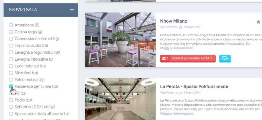 Se vuoi organizzare una sfilata e hai bisogno di una sala attrezzata con passerella, sarà sufficiente cliccare sui filtri che trovi a sinistra della pagina per scremare la ricerca. Vuoi il videoproiettore in sala? Vuoi la piscina nella location? Vuoi…? Basta filtrare la tua ricerca.