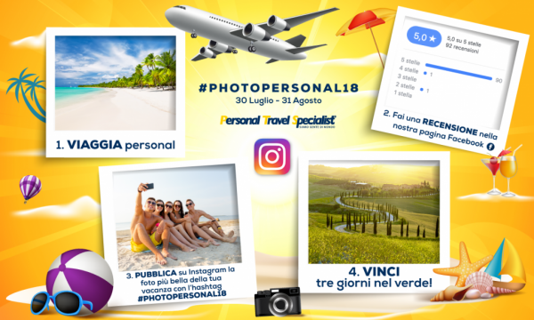 Dal 30 luglio al 30 agosto 2018 Personal Travel Specialist, la rete di consulenti di Uvet, lancia #photopersonal18: è il social game che consente a tutti i clienti di scrivere una recensione sulla pagina FB Personal Travel Specialist, commentando liberamente la qualità del servizio di vendita. E subito dopo di postare una foto della vacanza su Instagram con #photopersonal18, per essere anche così protagonisti sui social. A fine agosto verrà premiata la foto più apprezzata.