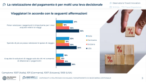 Quanto a opzioni di acquisto e metodi di pagamento, negli ultimi due anni è aumentato il ricorso alla tariffa flessibile. Gli italiani che hanno prenotato un alloggio con possibilità di modifica/cancellazione fino all’ultimo sono infatti passati dal 34% del 2022 al 51% nel 2024. Inoltre, il pagamento rateizzato e il buy now pay later sono in molti casi una leva decisionale: il 18% dei viaggiatori tricolori e addirittura il 36% degli statunitensi dichiarano di acquistare soluzioni di viaggio solo da operatori che offrono queste modalità di pagamento.