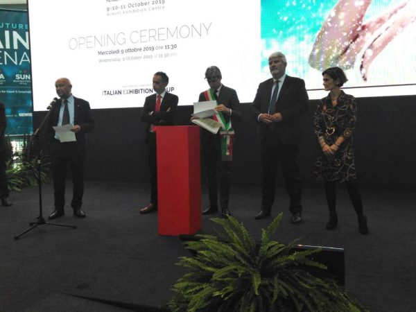 Solo posti in piedi per gli ospiti e anche per il pubblico convenuti nella Main Hall del quartiere fieristico di Rimini dove si sono svolte la breve cerimonia di apertura e il taglio del nastro della 56 esima edizione di TTG Travel Experience e di SIA HOSPITALITY Design e Sun Beach & Outdoor alla presenza di Lorenza Bonaccorsi, neo sottosegretario di Stato al turismo, Lorenzo Cagnoni, presidente di IEG Group S.p.A. , Andrea Gnassi sindaco di Rimini, Andrea Corsini assessore al turismo della Regione Emilia Romagna, Giorgio Palmucci presidente Enit.
