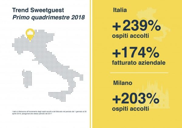 «Siamo davvero soddisfatti, i numeri sono molto incoraggianti – dichiara Edoardo Grattirola co-founder di Sweetguest -. I risultati del primo quadrimestre del 2018 confermano che ci stiamo muovendo nella direzione giusta, e che stiamo rispondendo alle esigenze del mercato nel migliore dei modi, con professionalità, flessibilità e approccio innovativo. I mesi estivi rappresentano una grande sfida, ma siamo certi che daranno grandi soddisfazioni sia a noi, sia ai proprietari di casa nostri partner».