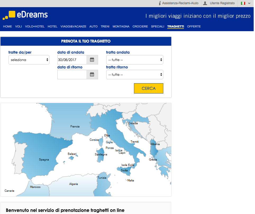 Traghettilines ha siglato una nuova partnership con eDreams: la ota amplia dunque la propria offerta dedicando al canale traghetti un’intera sezione del proprio sito e lo fa avvalendosi del portale specializzato nella vendita online di biglietteria marittima. Nella homepage del sito eDreams è già attivo il nuovo tab “traghetti” in cui è contenuto il booking Traghettilines attraverso il quale è possibile scegliere e prenotare le partenze di 40 compagnie di navigazione su oltre 1200 rotte nel Mediterraneo.