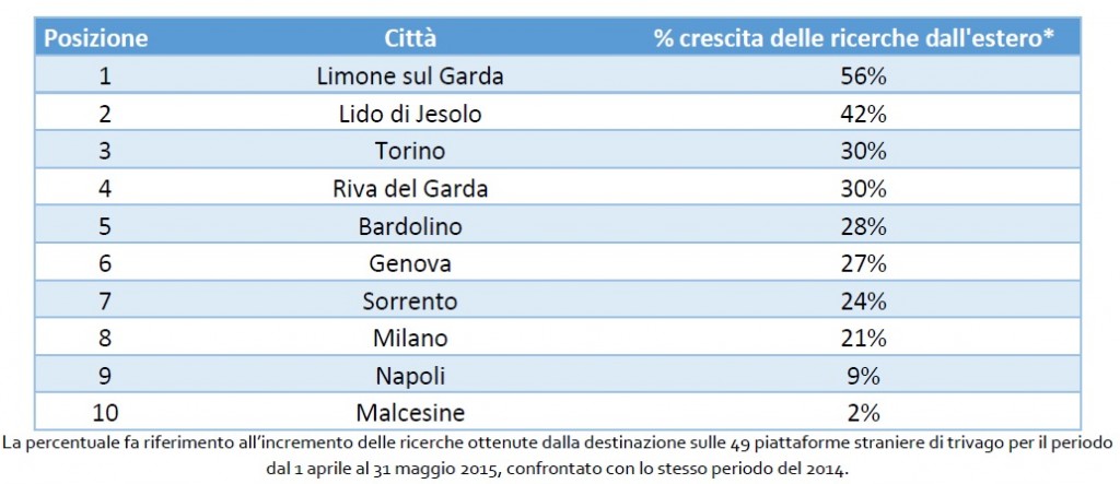 Secondo i dati raccolti dall’Osservatorio trivago, tra le 10 destinazioni che registrano il maggior incremento di ricerche dall’estero rispetto allo scorso anno, spicca Limone sul Garda (+56% di ricerche), Lido di Jesolo (+42%) e Torino (+30%). Lo studio prende in considerazione le ricerche effettuate da parte dei turisti stranieri nell’intervallo1° aprile-31 maggio 2015. Rispetto all’anno trascorso si evince una significativa crescita delle località sul lago di Garda, con ben 4 destinazioni presenti nella top 10. Oltre la capolista Limone sul Garda, crescono anche Riva del Garda (+30%), Bardolino (+28%) e Malcesine (+2%). In crescita oltre Torino anche Genova (+ 27%) e Milano (+21%). In classifica anche mete a due passi dal mare come Sorrento (+24%) e Napoli (+9%).