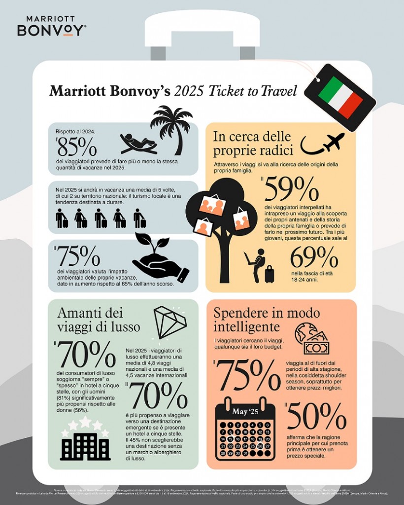 Secondo lo studio Ticket to Travel 2025 presentato nei giorni scorsi da Marriott Bonvoy, l’85% dei viaggiatori italiani prevede di fare nel 2025 lo stesso numero o più vacanze rispetto al 2024. La ricerca, condotta su 21.374 adulti in 10 mercati in Europa, Africa e Medio Oriente (EMEA) e su oltre 2.000 viaggiatori in Italia, individua anche le tendenze di viaggio emergenti e in crescita.