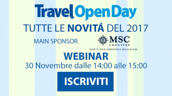 Il 30 novembre 2016 si terrà il nuovo webinar per scoprire tutte le novità dei Travel Open Day 2017. In primis, il main sponsor di tutti gli incontri Msc Crociere. Il webinar è gratuito e rivolto a tutti gli operatori del turismo e alle agenzie di viaggio. Relatori dell’incontro online saranno Leonardo Massa (country manager Italia MSC Crociere), Daniela Battaglioni (direttore generale Travel Quotidiano ) e Massimo Manchi (Webinar&Travel Open Day). Tra le novità che saranno illustrate, nuovi concorsi, interessanti eventi formativi gratuiti per agenti di viaggio, formule d’incontro innvative e molto altro ancora.