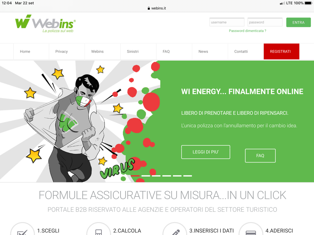 Wi Energy è la nuova polizza disponibile sul portale Webins, piattaforma b2b di distribuzione di prodotti assicurativi dedicati alle adv. «Amici con Super poteri possono fare la differenza, con Wi Energy sei libero di prenotare e libero di ripensarci – commenta Marcello Alesse, ceo di B&T Insurance Service, nel presentare la nuova polizza Wi Energy rappresentata da uno dei nuovi “super eroi” che “animano” il portale Webins.it – L’adv, scegliendo e proponendo questa polizza al suo cliente/viaggiatore, oltre ad assicurarlo con la classica copertura annullamento per cause documentabili (es. malattia improvvisa, gravi eventi che coinvolgono i familiari ed altro), gli darà la libertà di prenotare la vacanza, con la consapevolezza di poter semplicemente cambiare idea e annullare il viaggio “per qualsiasi motivo”, fino a 11 gg. prima della data di partenza, senza l’obbligo di fornire alcuna documentazione che giustifichi il motivo della rinuncia a partire.