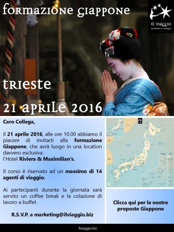 Il Viaggio Journeys & Voyages propone una serie di incontri di formazione sul Giappone rivolti ai professionisti del settore. Il primo avrà luogo giovedì 21 aprile 2016 a Trieste presso il Riviera & Maximilian’s Hotel & Spa, dalle ore 10 alle 16. In seguito sono previsti altri incontri nelle città di Roma, Napoli e Catania, […]→