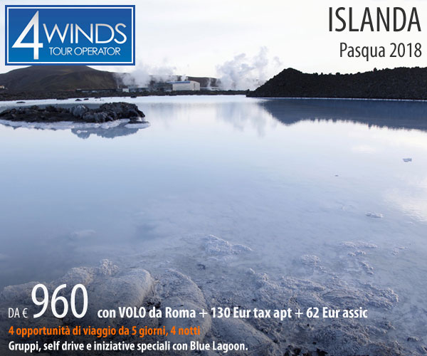 Da marzo a settembre l’operatore 4Winds propone itinerari self drive con partenze a data fissa in Islanda, destinazione che per le vacanze di Pasqua 2018 (5 giorni/4 notti) viene proposta anche per gruppi a partire da 960 euro con volo da Roma + 130 euro di tasse aeroportuali e 62 di assicurazione. 4Winds organizza inoltre viaggi e crociere alle iosole Svalbard.