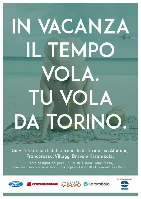 Sagat, la società di gestione dell’aeroporto di Torino e il gruppo Alpitour hanno realizzato una campagna di comunicazione congiunta per promuovere le partenze da Torino con lo slogan “In vacanza il tempo vola. Tu vola da Torino”, che viaggerà sui tram e nelle stazioni della metropolitana della città, sarà letto sui quotidiani e ascoltato dalle radio locali del Piemonte. Il gruppo Alpitour propone da Torino destinazioni estive come Ibiza, Minorca, Palma di Majorca e Marsa Alam (raggiungibili dal mese di giugno) ma anche Monastir e Djerba (Tunisia) e Kos in Grecia. Dal primo agosto partono invece nuovi voli per Mykonos e Santorini e dal 17 luglio si vola anche verso Creta e Rodi. Carlo Stradiotti, direttore generale business del gruppo Alpitour e amministratore delegato di Neos, dichiara: «Abbiamo abbracciato con entusiasmo la possibilità di collaborare con Sagat nella promozione di uno dei principali scali del nostro Paese. Insieme abbiamo realizzato una campagna promozionale di ottimo impatto, che vuole essere l’inizio di un percorso congiunto e di un investimento concreto nello sviluppo del traffico locale e dell’immagine delle rispettive aziende». La programmazione per l’estate del gruppo Alpitour da Torino prevede 42 rotazioni per le isole Baleari, 34 collegamenti sulla Grecia, 12 partenze alla volta di Monastir, 12 sull’isola di Djerba e 26 collegamenti con Marsa Alam.