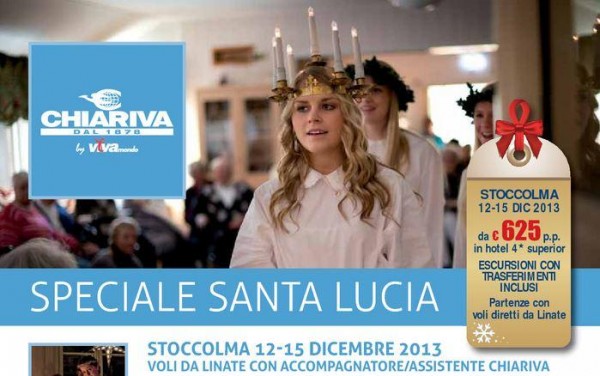 In occasione della festa di Santa Lucia Chiariva propone un pacchetto di 4 giorni/3 notti a Stoccolma, con diverse escursioni incluse. Il viaggio si svolge dal 12 al 15 dicembre, con voli diretti da Linate, accompagnatore/assistente Chiariva e pernottamento all’hotel Clarion Sign, 4 stelle superior, situato in posizione centrale. L’itinerario prevede una visita guidata della città (di circa 3 ore) con guida parlante italiano, tra Gamla Stan, il punto panoramico per ammirare la città, il palazzo reale e il municipio. La visita continuerà con il museo Vasa, dov’è conservato il famoso vascello del re Vasa recuperato dal fondale del mar Baltico; segue una passeggiata verso Skansen, la collina che ospita il museo all’aperto, con i tipici mercatini svedesi di Natale, dove la popolazione attende l’arrivo di Santa Lucia. Il suo carro trainato dai cavalli termina la sua processione proprio nell’anfiteatro di Skansen dove si potrà assistere ad uno spettacolo di canti natalizi e fuochi artificiali. Durante i 4 giorni, inoltre, i partecipanti avranno tempo a disposizione per effettuare delle visite individuali. Quota per persona: a partire da euro 625 per pernottamento in camera doppia.