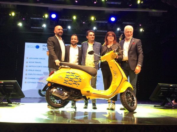 Premiate infine le 32 agenzie che hanno superato tutti e cinque i run di Segui-C nel 2018: per tutte l’ormai celebre Vespa gialla. Ma quella sul palco alla fine è stata sorteggiata: e l’ha vinta Videf di Savona, nella foto sopra.