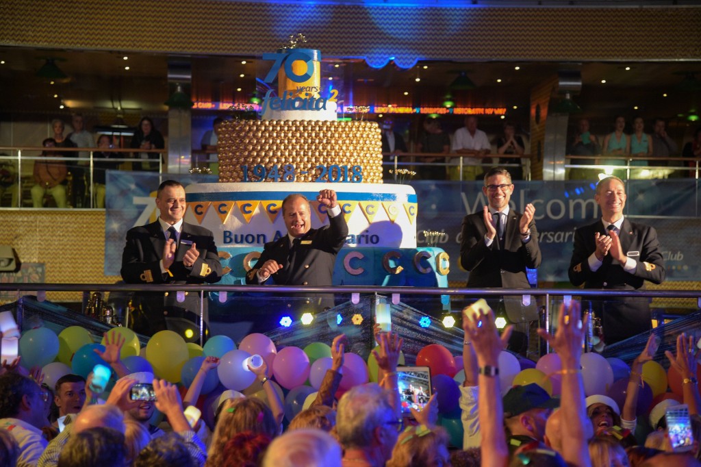 Costa Crociere ha festeggiato il suo 70° anniversario nel corso di una crociera speciale dedicata ai soci CostaClub a bordo di Costa Pacifica, un viaggio di 12 giorni nel Mediterraneo: un programma di eventi ricco di sorprese e invitati d’eccezione ha coinvolto circa 3 mila soci del CostaClub provenienti da 18 paesi differenti. Lo chef pâtissier Christophe Adam ha realizzato una piramide alta 3 metri con i suoi celebri e coloratissimi “Éclair de Génie” (dolci di pasta), mentre lo chef Bruno Barbieri, 7 stelle Michelin in carriera, da anni partner di Costa Crociere, è stato protagonista di un eccezionale showcooking. Star della crociera è stata Gloria Gaynor, che si è esibita in concerto nel teatro della nave, proponendo tutte le sue hit di maggior successo, come “I will survive” e “Never can say goodbye”.
