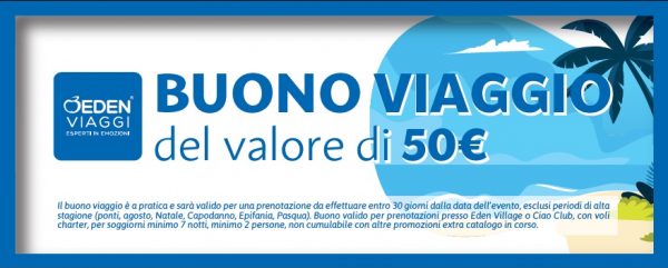 Il buono è valido per prenotazioni presso Eden Village e Ciao Club, con voli charter, per soggiorni di minimo 7 notti, minimo 2 persone, non cumulabile con altre promozioni extra catalogo in corso.