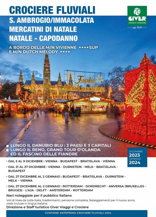 Le proposte includono la crociera di Sant’ambrogio e Immacolata mercatini di Natale dal 5 al 9 dicembre attraverso tre paesi e tre magnifiche capitali (Vienna, Budapest e Bratislava); la crociera di natale dal 21 al 27 dicembre attraverso tre paesi, tre capitali e non solo… (Vienna, Budapest, Bratislava e valle del Wachau); la crociera di Capodanno dal 27 dicembre al 3 gennaio attraverso tre paesi e tre scintillanti capitali (Budapest, Bratislava, Durnstein, Melk, Vienna). Per gli itinerari sul Danubio, Giver ha scelto la Vivienne, unità fluviale costruita nel 2000 e ristrutturata nel 2020. La nave dispone di sala feste, bar e ristorante con ampie finestre panoramiche. Dispone inoltre di ascensore e montascale, boutique, sala lettura, servizio wifi (gratuito salvo copertura di rete), servizio lavanderia. La Vivienne è dotata di quattro ponti passeggeri; tutte le cabine, comprese suite e Grand suite, sono esterne doppie. Le cabine standard misurano 15 metri quadrati, sul ponte superiore ci sono due suite di 22 mq e una Grand suite di 30 mq.