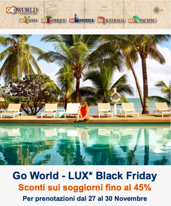 E’ tempo di Black Friday per Go World. Per tutte le prenotazioni confermate dal 27 al 30 novembre relative a tre offerte per soggiorni alle Maldive e Mauritius dal 1 febbraio al 31 ottobre 2021, si riceve uno sconto sul soggiorno fino al 45% e nessuna penale per cancellazioni fino a 7 gg prima della data di partenza.