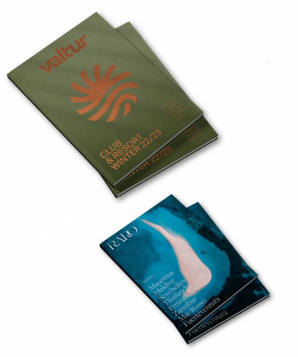 Merita, in particolare, una menzione per il catalogo Valtur la dimensione maxi, tipica dei volumi da collezione, e la scelta radicale di non utilizzare un’immagine in copertina, ma di creare un effetto hype affidandosi solo al contrasto di cromie tra il tono delicato dello sfondo e le note metallescenti del caldo oro rosso del lettering. Preziosa la carta dalla grammatura importante e dall’effetto tattile piacevolmente ruvido. E per ciò che concerne la carta di entrambi i volumi il gruppo Nicolaus ha fortemente voluto mettere in primo piano la sostenibilità, utilizzando la tipologia Magno Volume, certificata Ecf (Elemental chlorine free).
