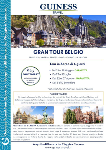 Il Gran Tour Belgio, che prevede tra l’altro il pernottamento a due passi dalla stupenda Grande Place, prevede per esempio tra le tante visite guidate numerose degustazioni di birre e prodotti tipici, molte delle quali effettuate all’interno di rinomati birrifici, dove sarà possibile conoscere le varie fasi della produzione del prodotto.