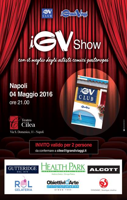 I Grandi Viaggi organizza per la prima volta a Napoli un evento unico per premiare la fidelizzazione dei clienti al marchio e soprattutto ai quattro villaggi Igv Club Mare Italia. Si tratta di una serata-evento organizzata presso il teatro Cilea di Napoli mercoledì 4 maggio alle ore 21. La serata sarà presentata dalla direttrice artistica Debora Villa e vedrà alternarsi sul palco del Cilea alcuni dei maggiori artisti comici napoletani. Inoltre, sarà presente il management de I Grandi Viaggi insieme ai direttori dei Villaggi Igv Club Mare Italia. L’evento è stato realizzato con la sponsorizzazione di marchi prestigiosi, quali Guttridge, Health Park, Alcott.