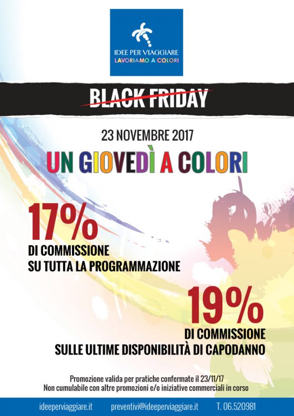 Idee per Viaggiare lancia la controffensiva sul fronte delle prenotazioni parafrasando il concetto di “black friday” il venerdì nero, giornata dedicata a sconti da capogiro in tutti i grandi magazzini, e non solo, del mondo anglosassone. «Vogliamo festeggiare insieme a tutte le agenzie che offrono i nostri viaggi una giornata a colori, riconoscendo commissioni speciali solo oggi 23 novembre – ha dichiarato Roberto Maccari, co-owner del tour operator – “Lavoriamo a Colori” è il nostro payoff e dunque invece di un “venerdì nero” proponiamo un gioioso “giovedì a colori”». L’occasione è ghiotta per tutti gli agenti di viaggio che potranno contare sulla commissione del 17% su tutto il prodotto Idee per Viaggiare e del 19% sulle ultime disponibilità per il periodo delle feste natalizie e del Capodanno 2018, l’importante è che le prenotazioni siano inviate entro oggi, 23 novembre.