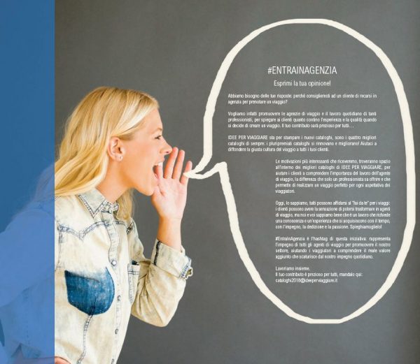 «Con #EntraInAgenzia vogliamo coinvolgere gli agenti di viaggio in un obiettivo comune: spiegare ai viaggiatori perché affidarsi a un professionista per organizzare un viaggio o una vacanza – ha annunciato Danilo Curzi, ceo di Idee per Viaggiare -. Vogliamo inserire le motivazioni più convincenti in uno spazio dedicato all’interno dei nuovi cataloghi, di fatto i quattro migliori di sempre: un concentrato di cultura turistica che migliora ed amplia i pluripremiati cataloghi di Idee per Viaggiare». L’iniziativa #EntraInAgenzia mira a trasmettere ai clienti viaggiatori l’importanza dell’assistenza professionale nella realizzazione di un progetto di viaggio. Un’argomentazione scontata per chiunque lavori nel settore del turismo, ma che molti clienti finali ignorano, al punto da concepire il “fai da te” su internet come una soluzione accettabile, anche per i viaggi più complessi e a lungo raggio, che più di tutti invece, possono beneficiare dell’assistenza di un agente di viaggio. #EntraInAgenzia accompagnerà il tour operator alla Bmt. L’iniziativa è comunque aperta al contributo di tutti gli agenti di viaggio, che possono proporre su internet le loro motivazioni utilizzando l’hashtag #EntraInAgenzia oppure possono inviare direttamente le loro opinioni alla casella email cataloghi2018@ideeperviaggiare.it