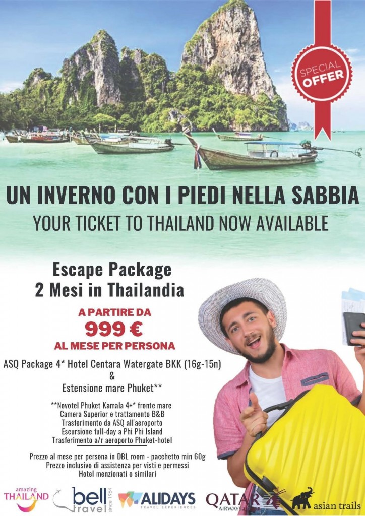 Due mesi interi in Thailandia a partire da 999 euro al mese, a persona, inclusa la quarantena obbligatoria di 14 giorni a cui sono tenuti tutti i turisti e i visitatori stranieri in arrivo nel Paese. E’ la proposta Escape Package lanciata da da Asian Trail in collaborazione con Bell Travel e Alidays, a seguito della recente riapertura dei confini del Paese al turismo internazionale.