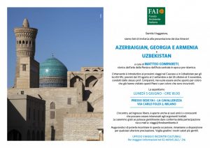 Il tour operator milanese Lombard Gate presenta oggi, lunedì 5 giugno, due viaggi organizzati per gli iscritti al Fai – Fondo ambiente italiano: Azerbaigian, Georgia e Armenia (dal 20 agosto al 2 settembre) e Uzbekistan (dal 24 ottobre al 3 novembre). L’appuntamento è presso la sede milanese del Fai, via Carlo Fondi 2, dove lo storico dell’arte della Persia e dell’Asia centrale in epoca preislamica, prof. Matteo Compareti, illustrerà entrambi gli itinerari, da lui stesso guidati. L’incontro è aperto a tutti gli interessati; confermare la partecipazione scrivendo a viaggi@fondoambiente.it.