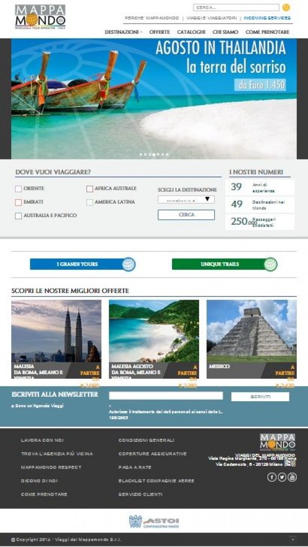 Mappamondo annuncia il lancio del nuovo sito istituzionale. Il to rilancia la propria presenza sul web con il nuovo sito www.mappamondo.com che si presenta oggi con una veste grafica fluida per rendere più fruibili ei contenuti, tutti nativi, e arrivare a raggiungere il maggior numero di utenti. «Abbiamo lavorato molto a questo progetto e siamo soddisfatti del risultato ottenuto – dichiara Daniele Fornari, responsabile del progetto -. Adeguarsi alle tendenze di distribuzione e digital marketing è diventato imprescindibile per il nostro business e per continuare ad essere al passo coi tempi. Il nuovo sito è il frutto di un attento lavoro di analisi per il quale ci siamo avvalsi della consulenza di affermati specialisti del webmarketing. Il sito è inoltre mobile responsive, attualizzato secondo la tecnologia e i nuovi trend di mercato, che vedono accessi e navigazione da dispositivo mobile e tablet in costante crescita». Una versione user friendly e full mobile responsive, per soddisfare le esigenze del viaggiatore contemporaneo che, grazie alle connessioni più veloci, a prezzi di accesso alla rete più contenuti e alla miglior risoluzione video degli schermi, oggi effettua sempre di più le visualizzazioni da device mobile. Con una connotazione più social e dinamica, arricchito di prodotto e di fotografie, il nuovo sito si presenta più intuitivo e funzionale con un rapporto one-to-one che permette di navigare con facilità alla ricerca di idee di viaggio e offre alle agenzie un ulteriore strumento di lavoro per finalizzare le vendite.
