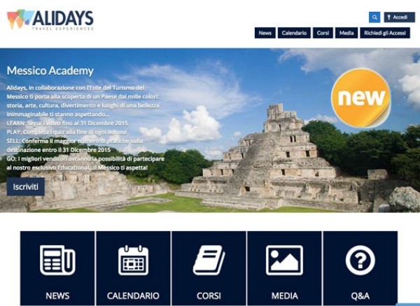 In collaborazione con l’ente del turismo del Messico, Alidays Travel Experiences presenta Messico Academy, il percorso formativo riservato agli agenti di viaggio sulla piattaforma alidays.it. Chi completa il training entro il 31 dicembre potrà partecipare a un educational in Messico previsto nel 2016. Attraverso quattro video realizzati in collaborazione con l’ente del turismo e visibili sulla piattaforma, gli agenti di viaggio possono apprendere informazioni e novità sulla destinazione, dimostrando, poi, le competenze acquisite attraversi i quiz. Messico Academy prevede, parallelamente, una fase di vendita durante la quale si deve confermare il maggior numero di pratiche Alidays sulla destinazione (solo Messico o itinerari combinati). I migliori venditori avranno quindi la possibilità di partecipare all’ educational.