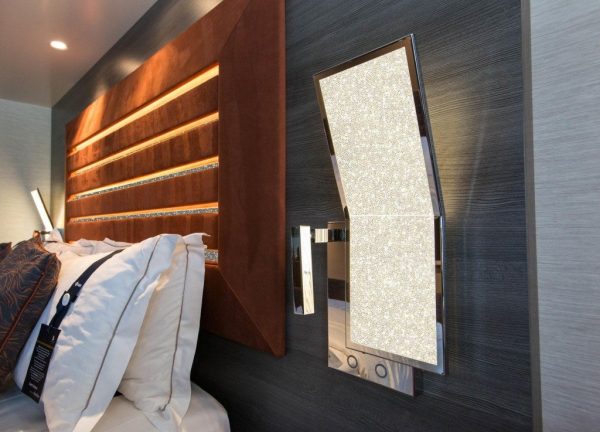 La nuova cabina in cristallo sarà situata nell’area di Msc Yacht Club e sarà riconoscibile grazie al numero sulla porta della cabina realizzato con gli Swarovski. Ogni elemento è stato scelto con cura, con l’obiettivo di aggiungere un tocco di eleganza, completando il design della cabina con 700 mila cristalli utilizzati anche per realizzare i comodini, la credenza e il tavolino da caffè. Le applique sono state appositamente studiate per offrire una splendida illuminazione in tutta la cabina. Anche le pareti hanno un tocco glamour, con opere d’arte in corallo scintillanti di cristalli.