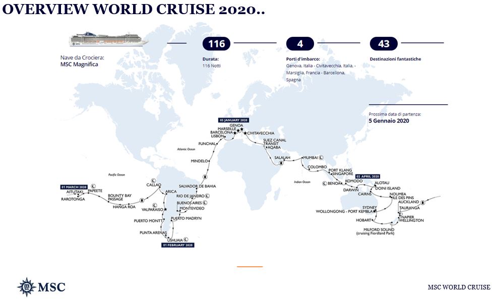 Ha preso il via da Genova la seconda crociera intorno al mondo di Msc Cruise. Gli ospiti di Msc Magnifica non solo visiteranno 43 fantastiche destinazioni nei 5 continenti, ma vivranno anche un vero e proprio viaggio gastronomico grazie a un menù internazionale unico nel suo genere e ai dieci chef pluripremiati provenienti da tutto il mondo, che rappresentano il meglio delle loro rispettive cucine: italiana, spagnola, brasiliana, argentina, colombiana, peruviana, hawaiana, cinese, indiana e tedesca. 43 destinazioni differenti in 117 giorni: da Ushuaia in Argentina a Valparaiso in Cile, da Callao/Lima in Perù a Rarotonga (Isole Cook) e poi ancora Nuova Zelanda, Australia, Papua Nuova Guinea, Bali, India e Giordania, con visita a Petra. « Anche se gli itinerari cambiano ogni anno – commenta Gianni Pilato, area manager Nord- Ovest di Msc Crociere – Genova resta sempre la città di partenza e di arrivo del nostro giro intorno al mondo. Infatti, anche nel 2021 e nel 2022 la world cruise Msc partirà sempre dalla città della lanterna e ciò testimonia il ruolo strategico che questa città riveste per la nostra compagnia. Una scelta che risulta peraltro molto apprezzata, visto che le vendite della world cruise 2021 stanno portando ottimi risultati e da circa un mese è possibile prenotare la World Cruise 2022: un viaggio di 117 giorni in partenza sempre da Genova e sempre il 5 gennaio alla scoperta di 43 destinazioni e 24 nazioni diverse a bordo di Msc Poesia».