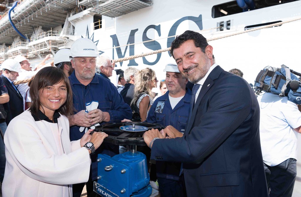 L’apertura delle valvole per il float out di Msc Seaview: il presidente della regione Friuli Venezia Giulia, Debora Serracchiani, con Gianni Onorato